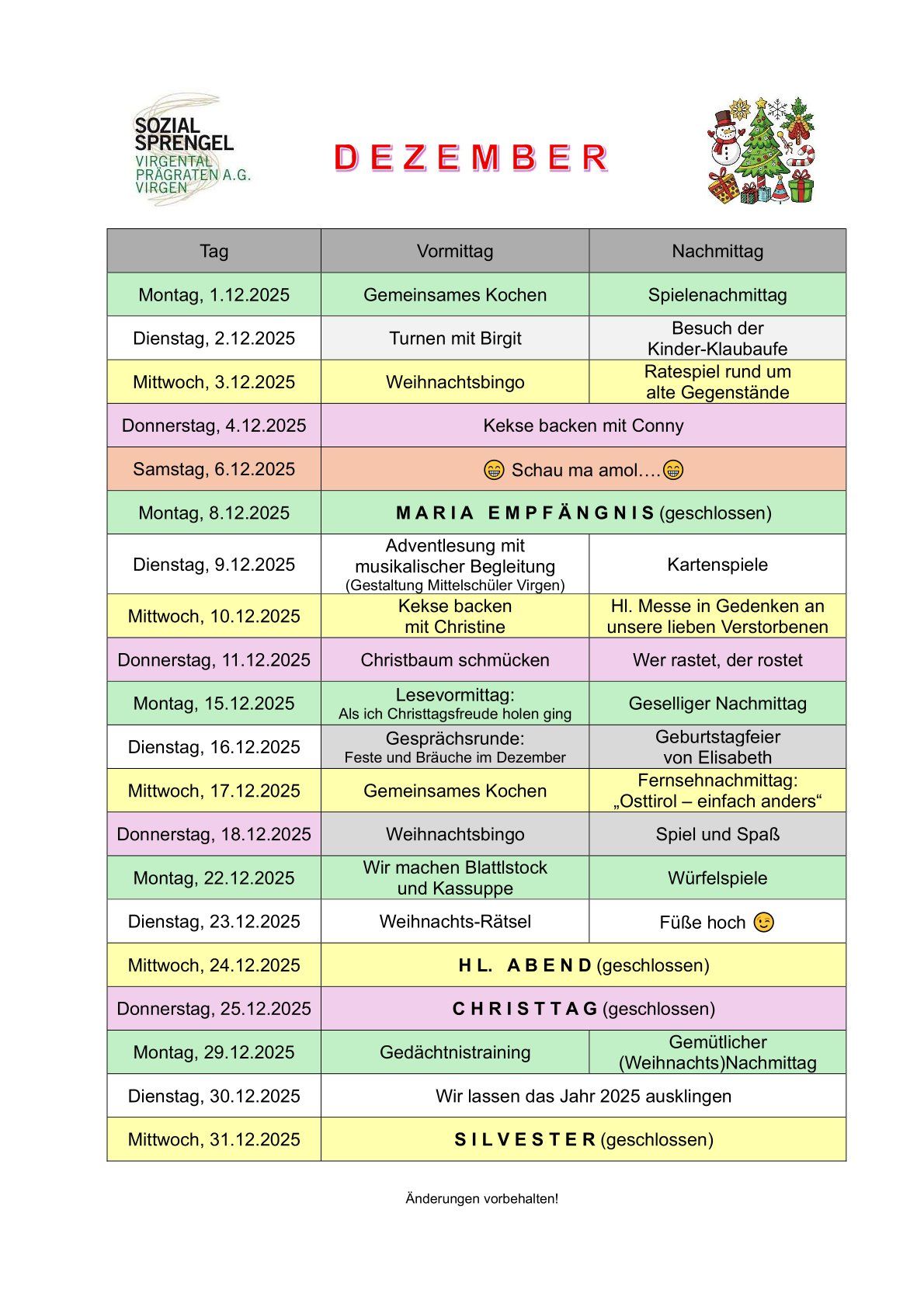 Aktivitäten Tagespflege Dezember 2025